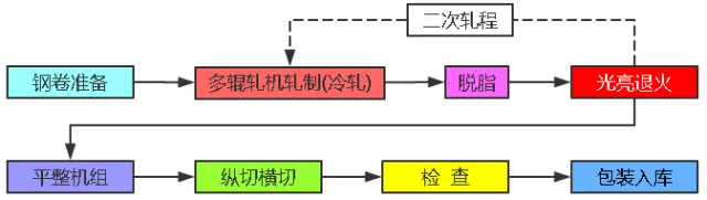 生產原料一般采用常規(guī)冷軋退火后的鋼卷,2B表面即可;其完整的生產工藝包括冷軋、退火、精整;根據產品規(guī)格及原料情況,可以采用一個或二個軋程。